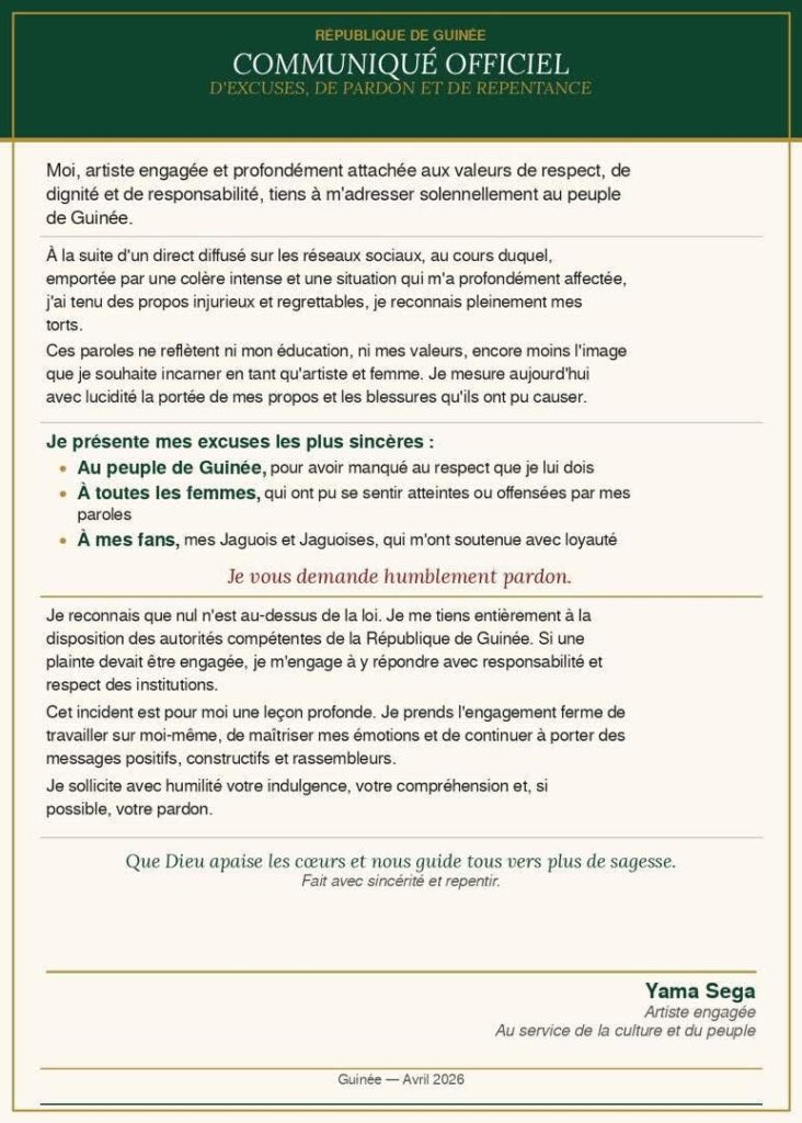 Après avoir tenu des propos injurieux sur les réseaux sociaux, l’artiste guinéenne Yama Sega est sortie du silence à travers un communiqué officiel d’excuses et de repentance adressé au peuple de Guinée.