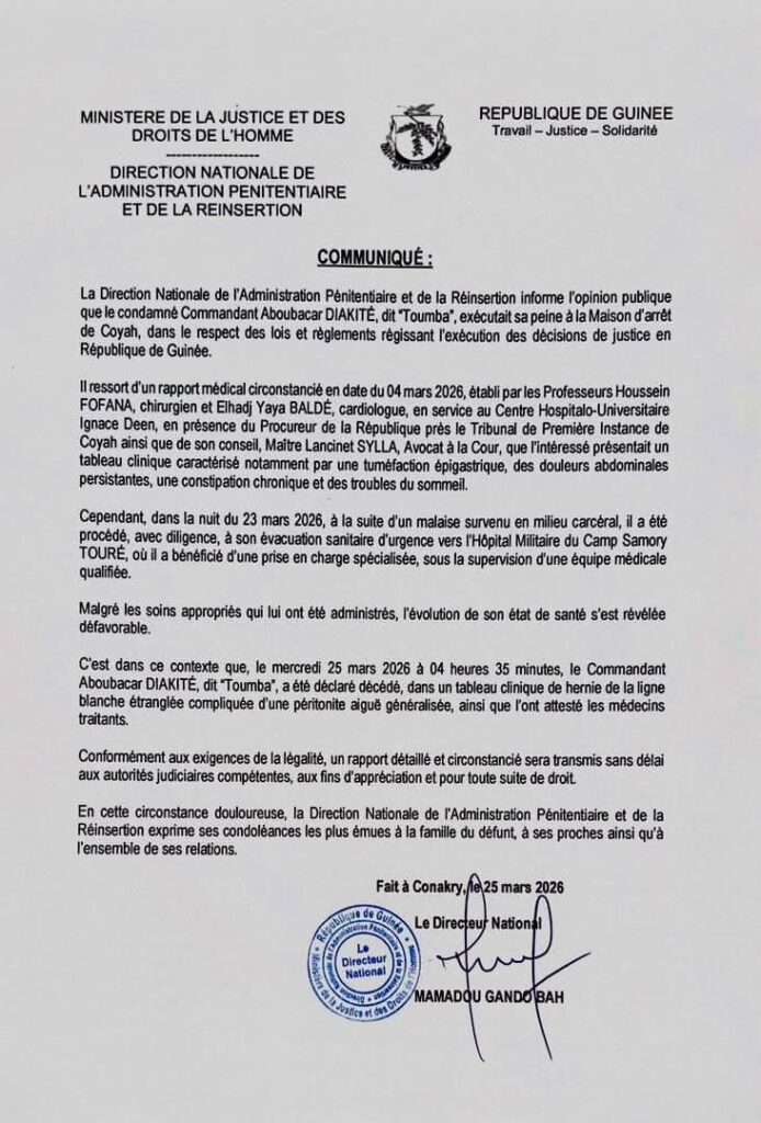 L’annonce de son décès a été rendue publique par l’administration pénitentiaire guinéenne par voie d’un communiqué officiel.