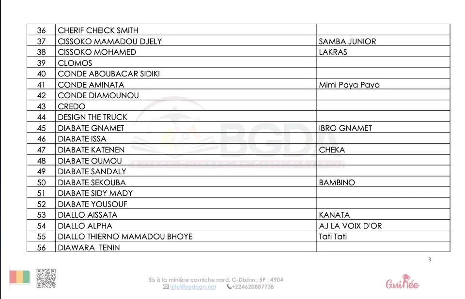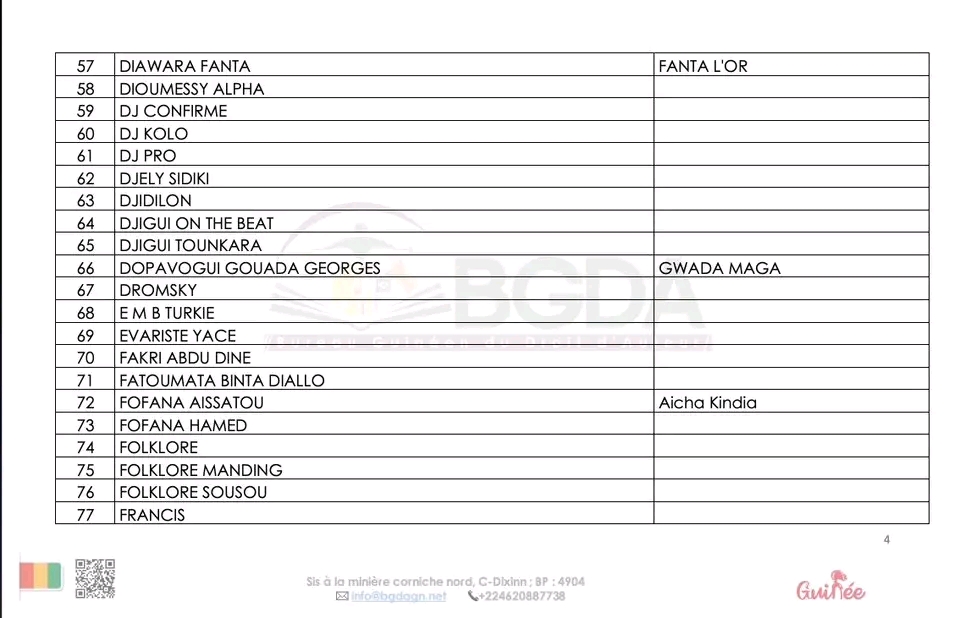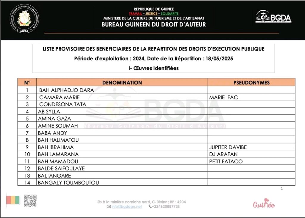 Dans un communiqué publié sur sa page Facebook, la Direction Générale du Bureau Guinéen du Droit d’Auteur (BGDA) a rendu publique la liste provisoire des bénéficiaires de la répartition des droits d’exécution publique pour la période d’exploitation 2024.Le montant net à répartir s’élève à 267 549 400 GNF.