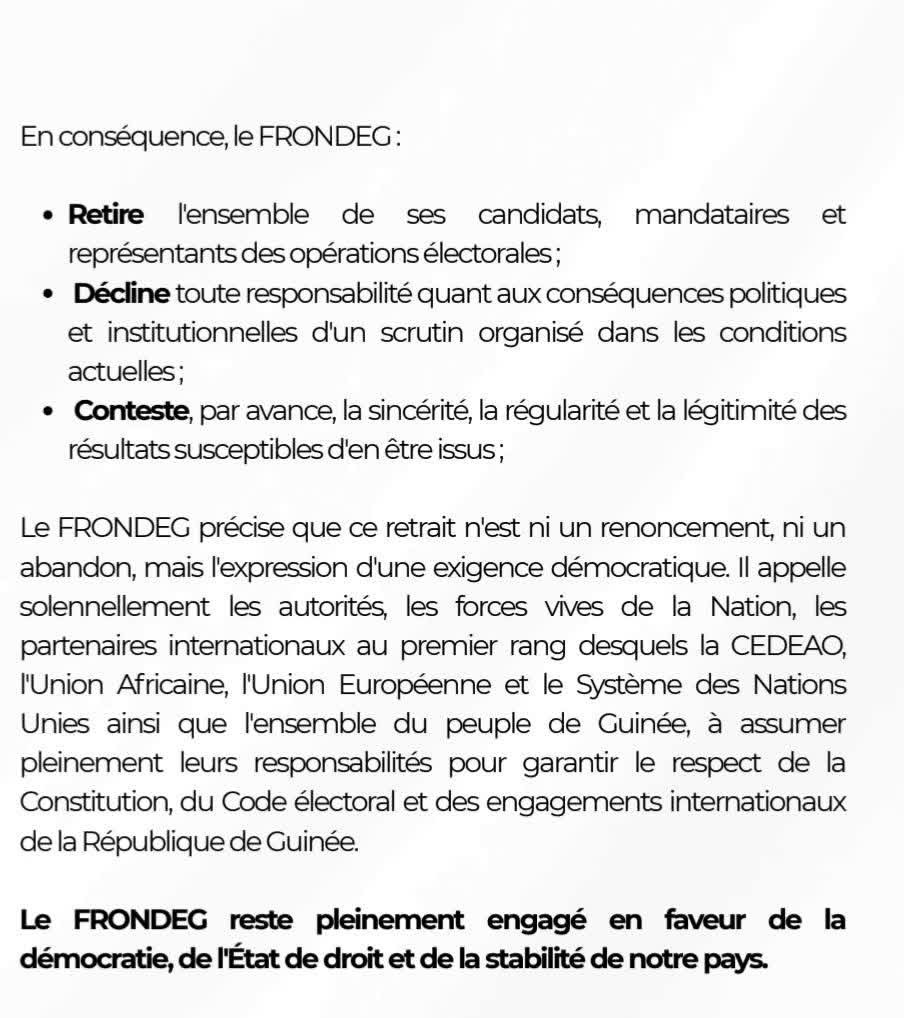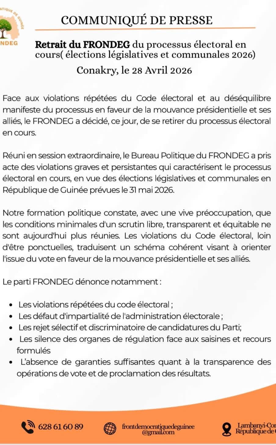 À quelques mois seulement des élections législatives et communales prévues le 31 mai, le Front démocratique de Guinée (FRONDEG) annonce son retrait pur et simple du processus électoral en cours.