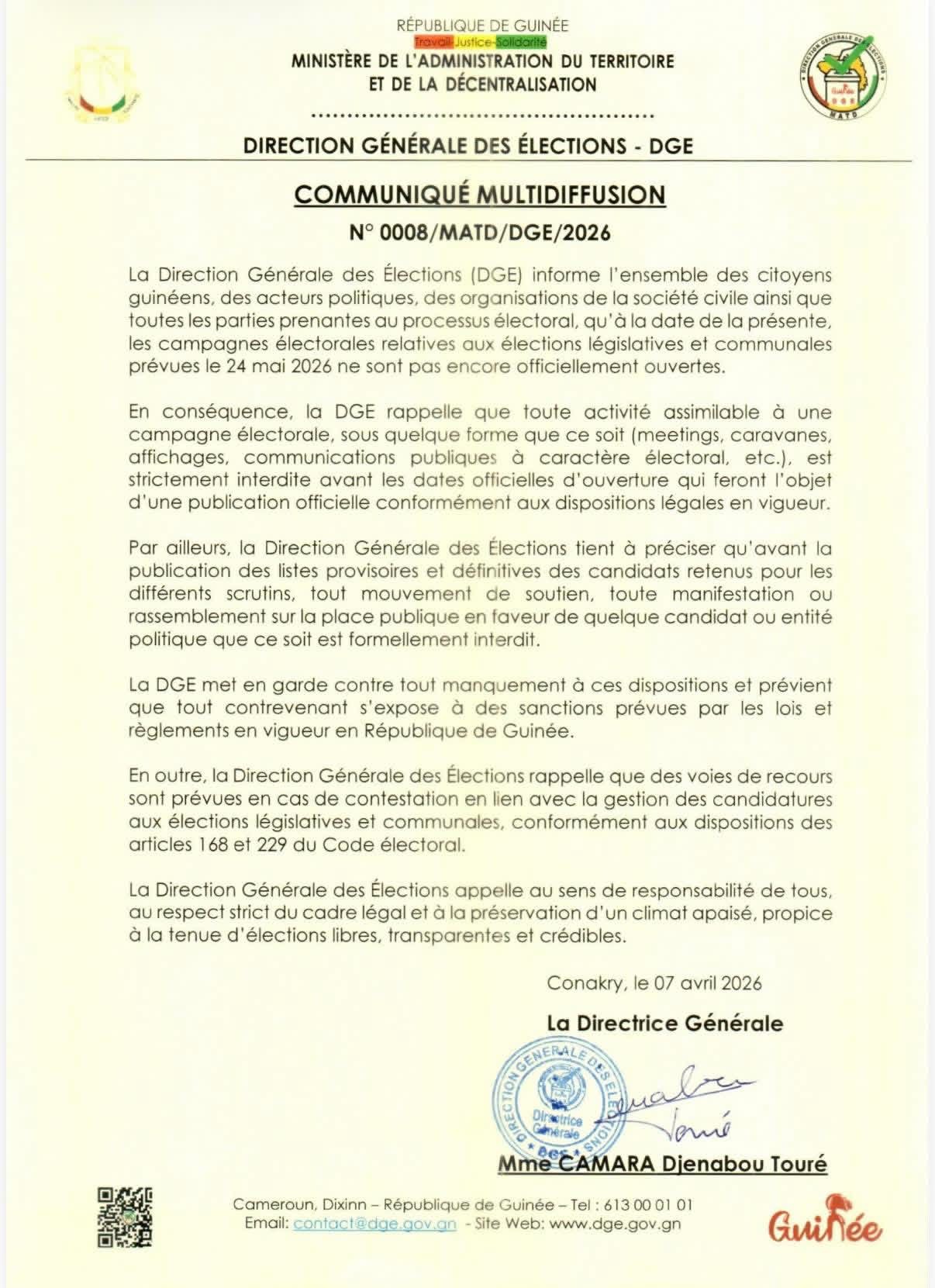Actualités Elections législatives et communales : la DGE interdit toute campagne avant le jour J 8 avril 20268 avril 2026 Balla Yombouno Dans un communiqué publié ce mardi 7 avril, la Direction Générale des Élections (DGE) interdit toute campagne prématurée , c’est-à-dire tout mouvement de soutien, caravane ou affichage à caractère politique sur l’étendue du territoire.