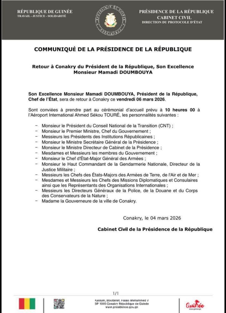 Dans un communiqué  signé de la Présidence de la République de Guinée  informe le peuple de Guinée que le chef de l’État, Mamadi Doumbouya, effectuera son retour à Conakry ce vendredi 6 mars 2026 après plusieurs jours d’absence.