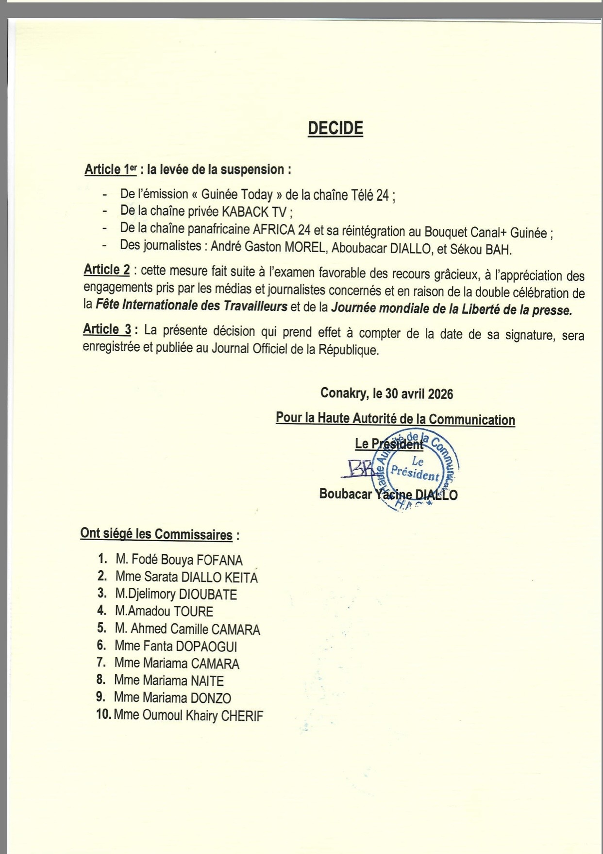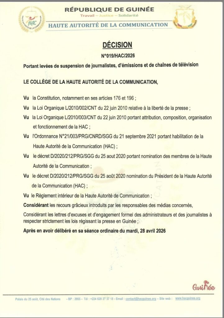 La Haute Autorité de la Communication (HAC), dirigée par Boubacar Yacine Diallo, a annoncé via un communiqué rendu public ce jeudi 30 avril à levée la suspension de plusieurs médias et des professionnels de l’information.