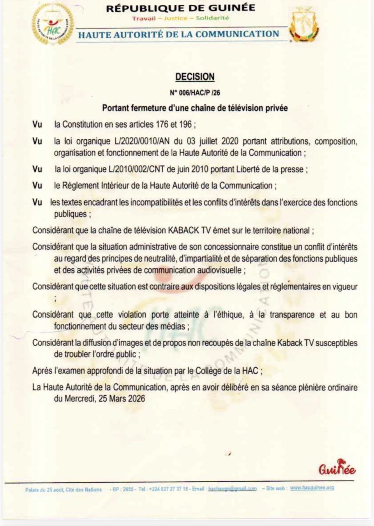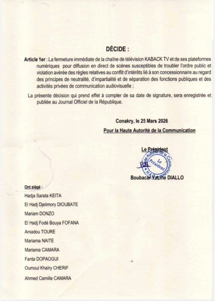 Actualités Médias : la HAC ordonne la fermeture immédiate de Kaback TV 25 mars 202625 mars 2026 Balla Yombouno Dans une décision rendue publique ce 25 mars 2026, la Haute autorité de la Communication, l’organe de régulation des médias, ordonne la fermeture immédiate de la chaîne privée Kaback TV, ainsi que de l’ensemble de ses plateformes numériques