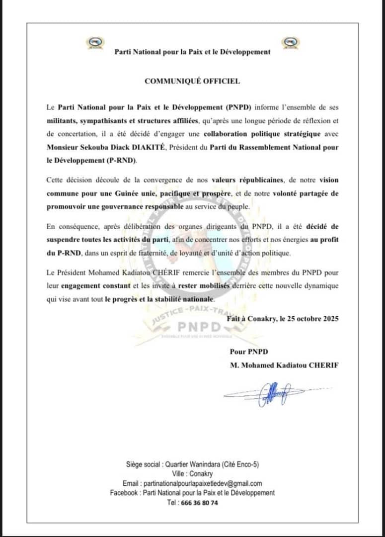 Le Parti National pour la Paix et le Développement (PNPD), dirigé par Mohamed Kadiatou CHÉRIF, a annoncé dans un communiqué rendu public qu’il engage désormais une collaboration politique stratégique avec M. Sékouba Diack DIAKITÉ, Président du Parti du Rassemblement National pour le Développement (P-RND).