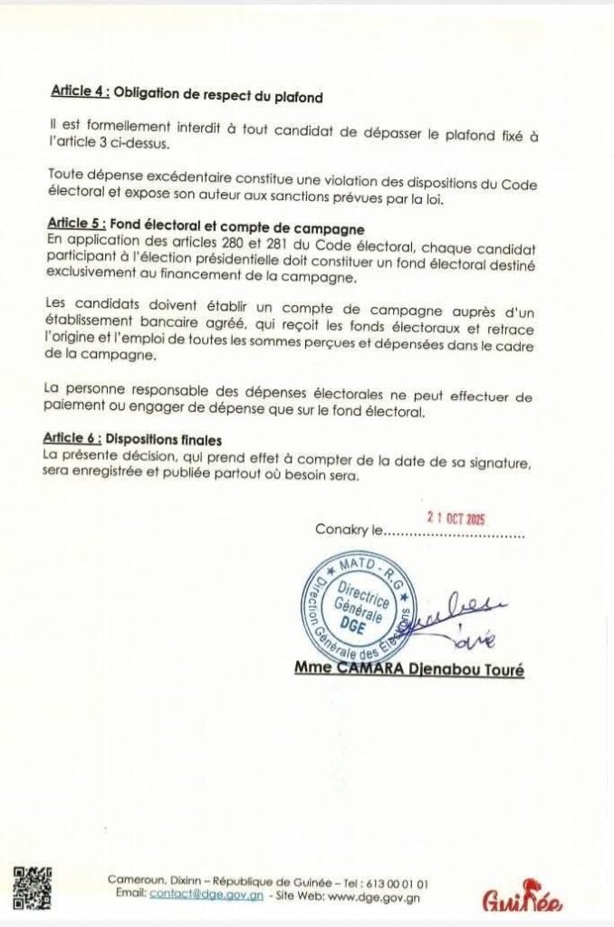 Par ailleurs, la directrice générale des élections, Djénabou Touré, précise que le montant global des dépenses de campagne électorale est plafonné à quarante milliards (40 000 000 000) de francs guinéens (GNF) par candidat.