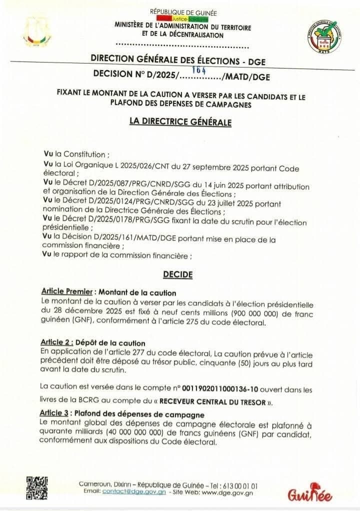 La Direction Générale des Élections (DGE) vient de lever le suspense. Dans sa décision numéro Numéro D 2025 signé par sa directrice générale, elle a fixé le montant de la caution à verser par les candidats à l’élection présidentielle du 28 décembre 2025 à neuf cents millions (900 000 000) de francs guinéens (GNF), conformément à l’article 275 du Code électoral.