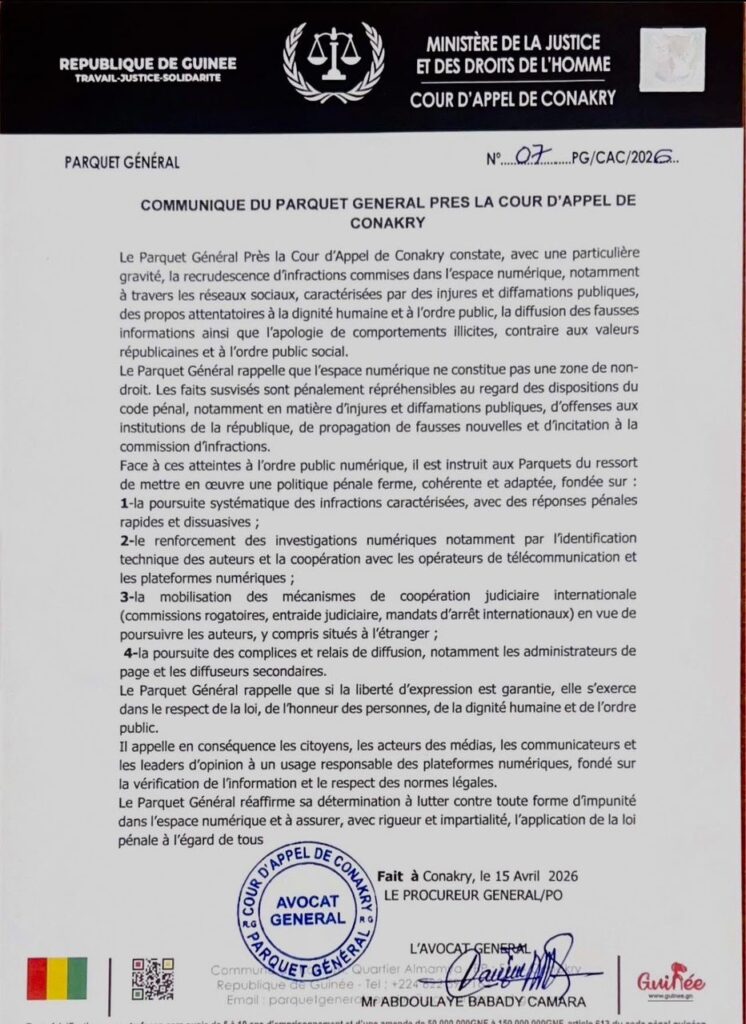 Dans un communiqué rendu public ce mercredi 15 avril, le Parquet général près la Cour d’appel de Conakry  a haussé le ton face à la recrudescence des infractions commises dans l’espace numérique, notamment sur les réseaux sociaux.