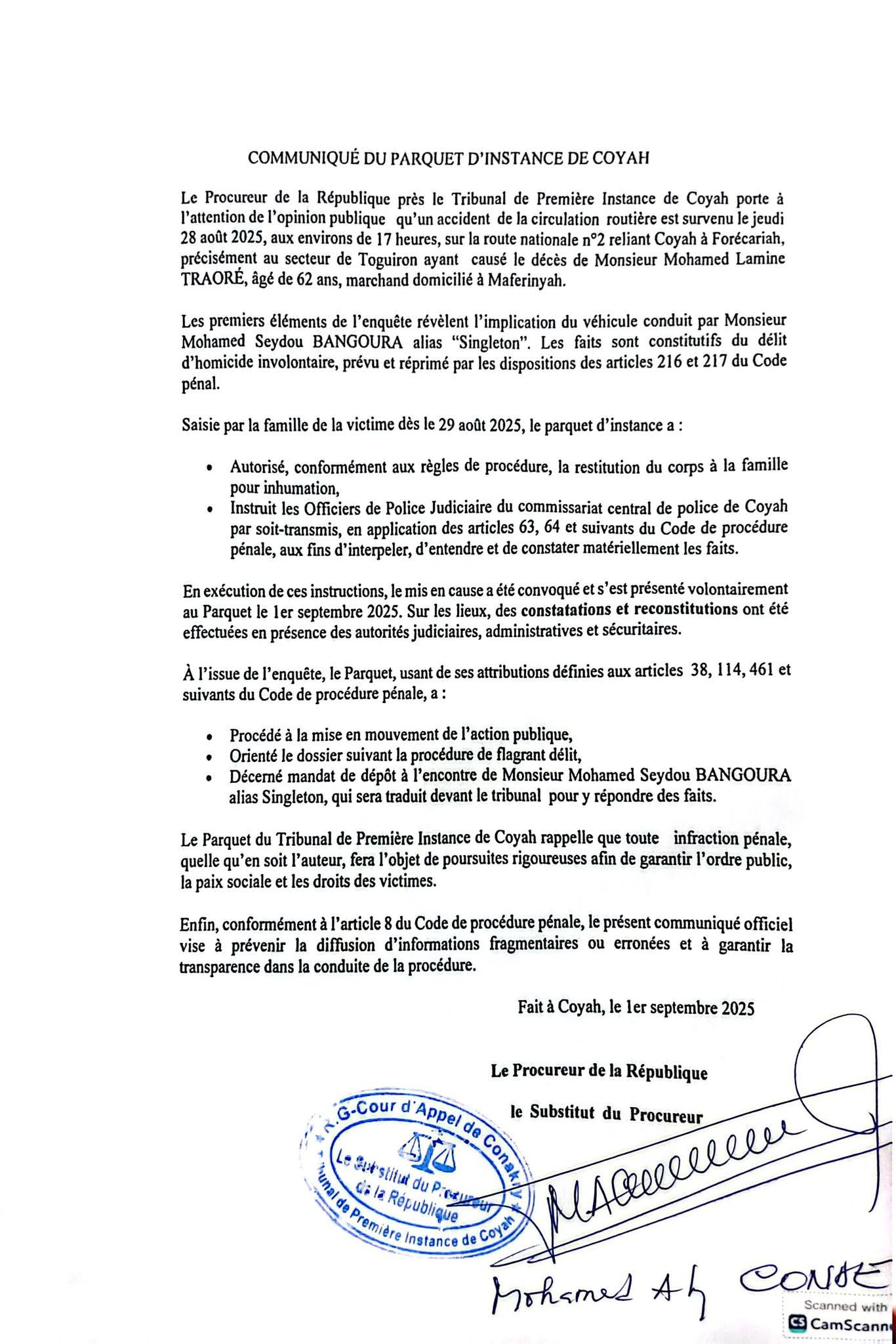 Nous venons de l’apprendre,l’artiste Mohamed Seydou Bangoura, alias Singleton vient d’être placé sous mandat de dépôt à la prison civile de Coyah.