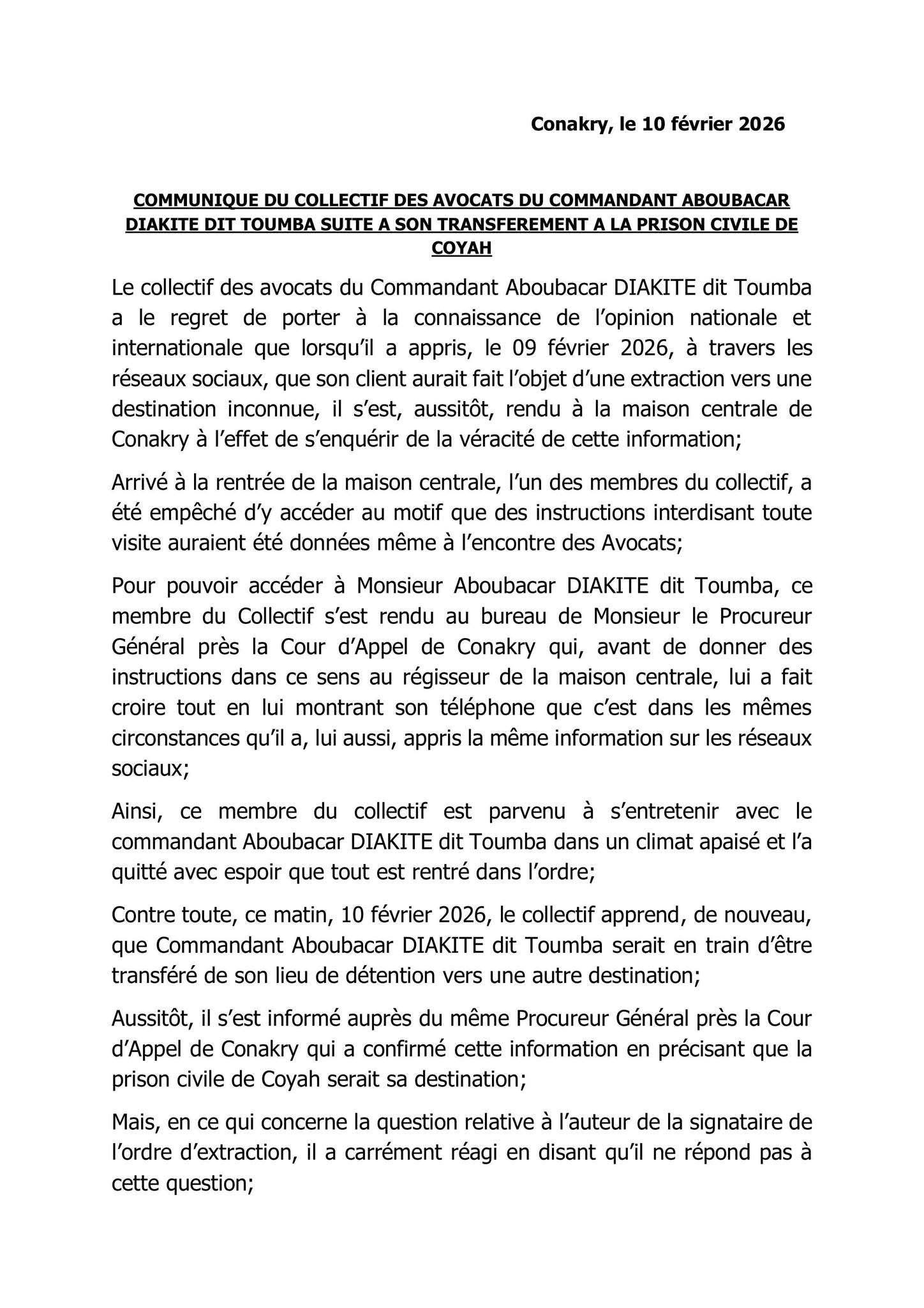 • Transfèrement de Toumba Diakité à la prison de Coyah: ses avocats dénoncent une mesure arbitraire (Communiqué)
